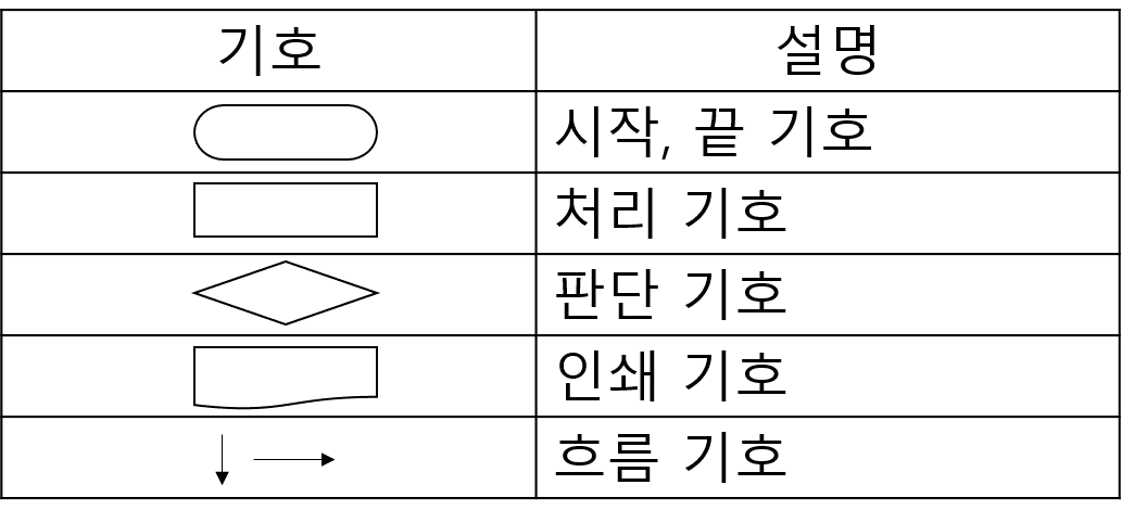 | 순서도 | 알고리즘을 그림으로 도식화해서 표현 | 알고리즘 각 단계를 직관적으로 표현할 수 있는 장점이 있으나, 복잡한 알고리즘을 나타내기에는 비효율적이다. |